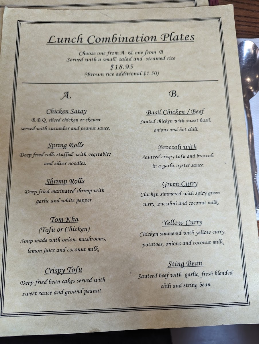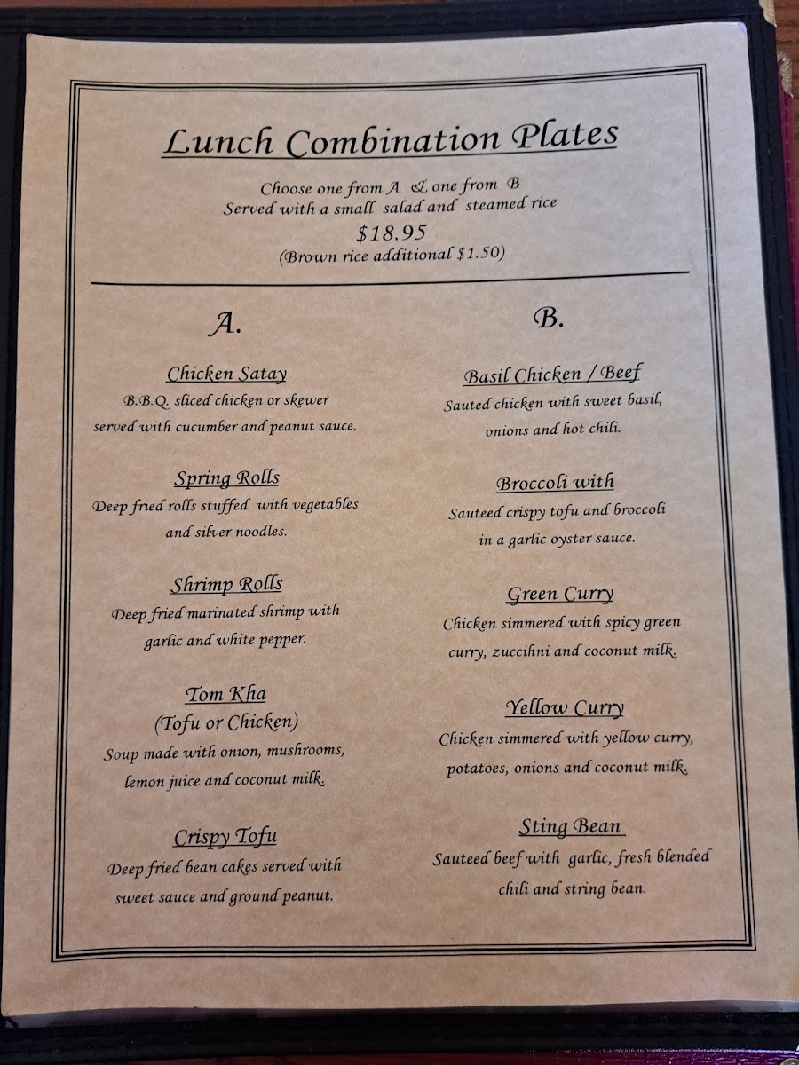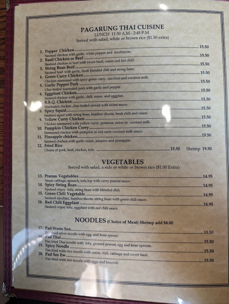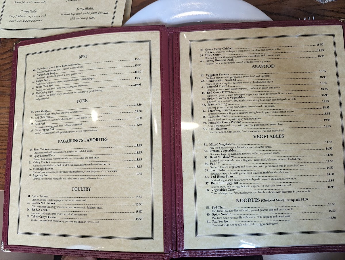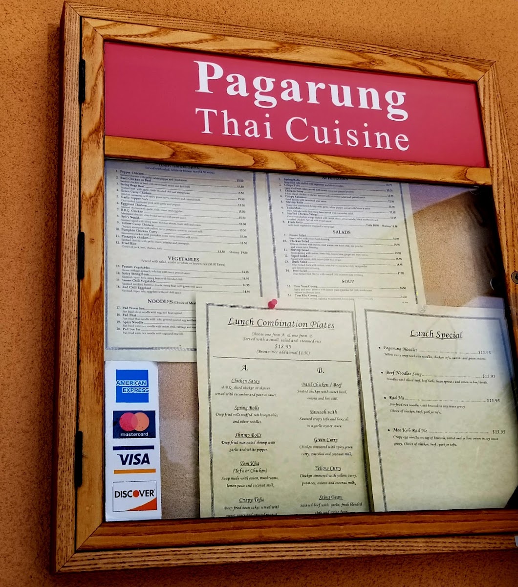 From start to finish, Pagarung Thai Cuisine’s menu reads like a vibrant tour of classic Thai flavors, offering tempting appetizers such as Spring Rolls, Crispy Tofu, Chicken Satay, Crispy Calamari, and Shrimp Rolls, followed by comforting bowls like Tom Yum Goong, Tom Kha Goong, Tom Kha Gai, Kang Jued, and Tofu Soup. Freshness continues with crisp salads - House Salad, Chicken Salad, Shrimp Salad, Squid Salad, and Duck Salad - before diving into rich entrées like Curry Beef, Praram Long Song, Ginger Beef, Green Chili Beef, and The Crying Tiger. Pork lovers can choose from Pork Kning, Red Chili Pork, Basil Pork, and Garlic Pepper Pork, while poultry options include Spicy Chicken, Cashew Nut Chicken, B.B.Q. Chicken, Yellow Curry Chicken, and Green Curry Sauce. Seafood selections like Eggplant Prawns, Combination Seafood, Emerald Prawns, Red Curry Prawn, and Spicy Prawns & Vegetables showcase the ocean’s best. House favorites such as Siam Chicken, Spicy Roasted Duck, Crispy Chicken, Moonlight Prawns, and Pagarung Beef stand out, and vegetable dishes like Mixed Vegetables, Praram Vegetables, Basil Mushrooms, Pad "J", and Basil Tofu round out the menu. Side orders including Cucumber Salad, Peanut Sauce, Steam Jasmine Rice, and Steam Brown Rice, add flexibility, with extras like Extra Prawns, Extra Vegetables, and Extra Chicken available, and a sweet finish offered by Ice Cream, Fried Banana With Honey, Trio Ice Cream, Fried Banana, and Sweet Sticky Rice.